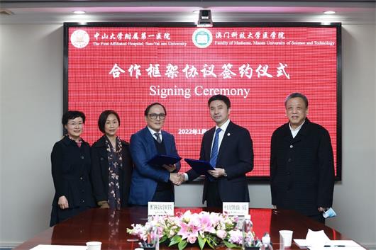 【本報訊】澳門科技大學醫學院與中山大學附屬第一醫院 (下稱「中山一院」),於2022年1月13日在廣州市中山一院院史館三樓會議室進行合作協議簽字儀式,雙方為加強醫療事業的發展和交流,經友好協商,本著「互相支援,友好合作,互利雙赢」的原則達成協議。