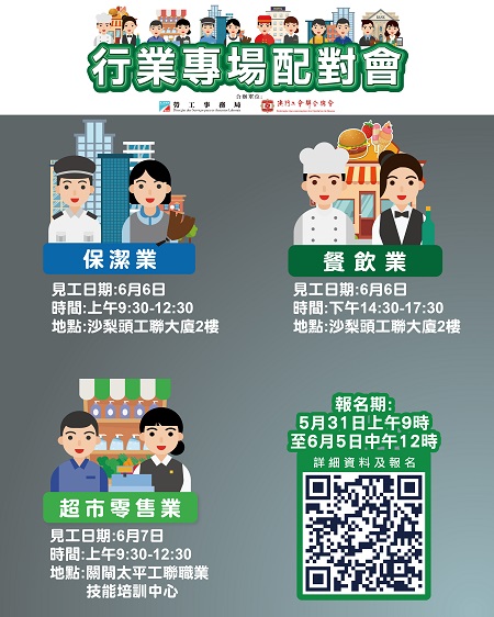 6月7日上午舉辦超巿零售業配對會,提供114個職位空缺,涉及收銀員、理貨員、蔬果包裝員、水產處理員、肉類切割員及送貨雜務員等。配對會在澳門工聯職業技能培訓中心(關閘馬路101-105A號太平工業大廈第一期1樓)舉行。