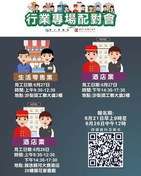 6月27日上午舉辦生活零售業配對會,提供188個職位空缺,涉及見習經理、店務組長、店務員、理貨員及收銀員等。下午舉辦酒店業配對會,提供51個職位空缺,涉及人力資源部主任、審計員、秘書、工程技工、倉庫管理員、前台服務員及房務員等。以上配對會在澳門工會聯合總會二樓(沙梨頭海邊街2-6號工聯大廈)舉行。