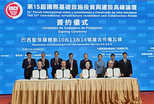 國家開發銀行國際金融事業部副總裁郭蕾、中國交通建設股份有限公司副總裁孫立強、澳門貿促局行政管理委員會主席余雨生及執行委員梁華峰、中國對外承包工程商會會長房秋晨及副會長于曉紅等出席並見證簽約。