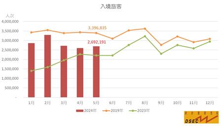 2024年首五個月的入境旅客共14,168,665人次,按年上升50.2%,恢復至2019年同期的82.4%;不過夜旅客(7,572,389人次)及留宿旅客(6,596,276人次)按年分別增加67.1%及34.5%。旅客平均逗留1.2日,較去年同期減少0.1日;留宿旅客(2.2日)及不過夜旅客(0.2日)的平均逗留時間均縮短0.1日。