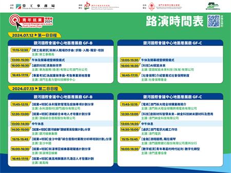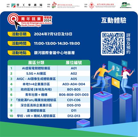 為做好進場的人流管理,有意參加上述各項活動的人士請提早網上預約,成功預約人士可獲發入場短訊,憑短訊優先入場,倘預約情況踴躍,體驗展區內如有需要,亦會派籌進行分流管理,明起至7月12日可登入勞工局青年就業博覽會專頁(https://www.dsal.gov.mo/zh_tw/standard/youthcareerexpo2024.html),從速預約,名額有限。