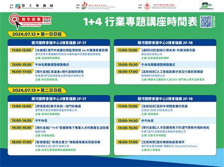設10場講座於二樓會議廳舉行,圍繞“1+4”產業佈局,邀請資深業界人士介紹未來行業發展前景和人才需求情況,助力青年及早認識產業發展和做好職涯規劃,透過與業界代表交流,為選科擇業青年提供建議。另外,亦設有生涯規劃諮詢室,為青年提供相關諮詢服務和提供撰寫求職履歷指導服務。