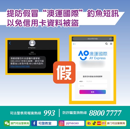 警情通告-司警局呼籲市民提防假冒“澳運國際”釣魚短訊 以免信用卡資料被盜