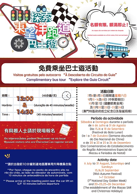 每個上述特定日子將舉行兩場免費巴士遊活動,時間分別為中午12時正及下午2時30分,博物館參觀者可憑當天的參觀門票於服務櫃枱報名,免費乘坐旅遊巴環繞澳門東望洋跑道一圈,名額有限,額滿即止。每班車程連同講解介紹約為45分鐘,沿途安排本地導遊陪同及介紹賽車跑道的特色,進一步豐富居民和旅客的參館體驗。