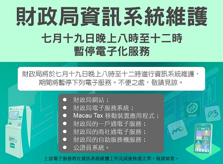 【本報訊】財政局將於七月十九日晚上八時至十二時進行資訊系統維護,期間將暫停下列電子服務。不便之處,敬請見諒。