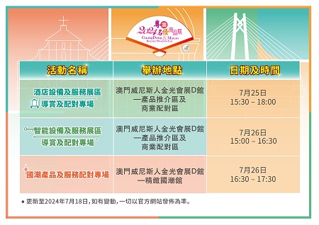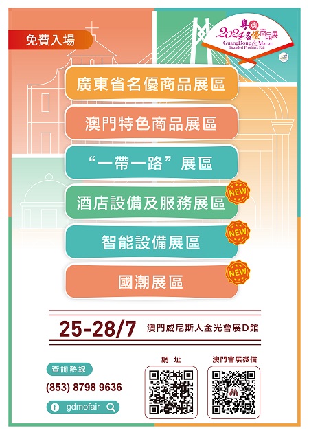 【本報訊】“慶祝中華人民共和國成立75周年、澳門回歸祖國25周年‧2024粵澳名優商品展”將於7月25至28日(周四至周日)假澳門威尼斯人金光會展D館舉行。今屆展會致力加大“企業對企業”(B2B)元素含量,新設3個亮點展區:酒店設備及服務展區、智能設備展區、國潮展區;並準備了3場商業配對專場以及多場豐富活動,包括“一會展兩地”同期活動、論壇、產品推介會、簽約儀式、導賞等,把展會成效由“展場內”延伸至“展場外”再拓展到橫琴粵澳深度合作區,發揮“產業+會展”和“會展+旅遊”的雙重疊加作用,並聯動展會招商引資,助力企業品牌得以創新發展和開拓商機。