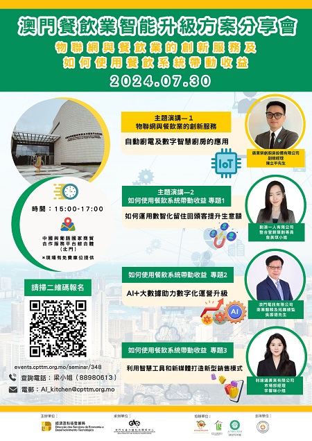 【本報訊】由經濟及科技發展局主辦、澳門生產力暨科技轉移中心承辦的“澳門餐飲業智能升級方案分享會”將於下週二(30日)下午3時至5時在中國與葡語國家商貿合作服務平台綜合體舉行,活動將邀請行業專家分享餐飲業如何利用科技提質發展,歡迎餐飲業界及有興趣人士報名參與。