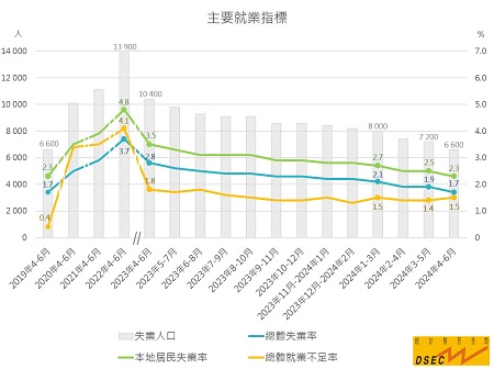 與今年3月至5月比較,4月至6月總體失業率(1.7%)及本地居民失業率(2.3%)均下跌0.2個百分點,就業不足率(1.5%)則微升0.1個百分點。居澳勞動人口共38.30萬人;就業人口(37.64萬人)及本地就業居民(28.70萬人)分別增加4,300人及3,400人。失業人數(6,600人)減少600人,已連續六期下跌,並與2019年同期相若。尋找新工作的失業人口中,以失業前從事博彩業和零售業的佔多。另一方面,尋找第一份工的新增勞動力佔總失業人口比重上升1.8個百分點至8.0%。