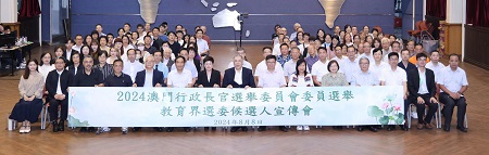 【本報訊】2024行政長官選舉委員會委員選舉將於本周日舉行,教育界選委候選人於8月8日下午6時在濠江中學校本部禮堂舉行宣傳會,宣傳會設線下會面及線 上直播,給予未克現場參與的人士線上觀看,邀請教育法人團體之投票人出席座談,藉此加強溝通交流,並對新一屆政府施政積極建言。會議由澳門中華教育會陳虹會長主持,共有29位教育界選委候選人以及近百名教育團體投票人出席,另有一百多位投票人在線上參會。