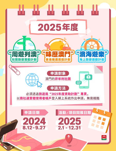 【本報訊】旅遊局2025年度的“周遊列澳”社區旅遊資助計劃、“味歷澳門”美食推廣資助計劃和“濱海遊樂”海上旅遊資助計劃於8月12日至9月27日接受申請,申請須以商社通帳戶登入旅遊局“2025年度資助計劃”專頁提交。