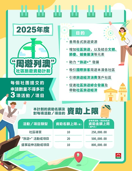 “周遊列澳”社區旅遊資助計劃:善用各式旅遊資源,結合文體、節慶、娛樂展演等元素,助力“旅遊+”發展,並透過商戶積極參與,引導旅遊消費落戶社區,吸引各地旅客周遊澳門各社區,從而創造及豐富旅遊體驗,達至促進社區旅遊綜合發展及帶動社區旅遊經濟。