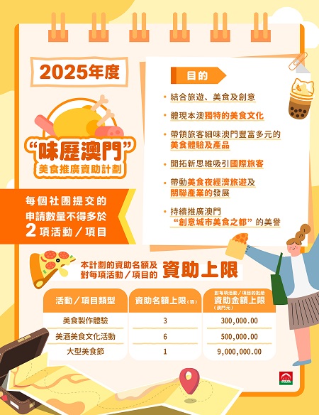 “味歷澳門”美食推廣資助計劃:結合旅遊、美食及創意,體現澳門獨特的美食文化,帶領旅客“細味”澳門豐富多元的美食體驗及產品,開拓新思維吸引各地旅客,帶動美食夜經濟旅遊及關聯產業的發展,持續推廣澳門“創意城市美食之都”的美譽。
