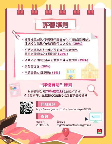 旅遊基金就各資助計劃制定了針對性的評審準則,以“擇優資助”為原則,審慎評估及分析所有申請。有關2025年度三項資助計劃的申請詳情,請瀏覽https://www.gov.mo/zh-hant/services/ps-1660/。