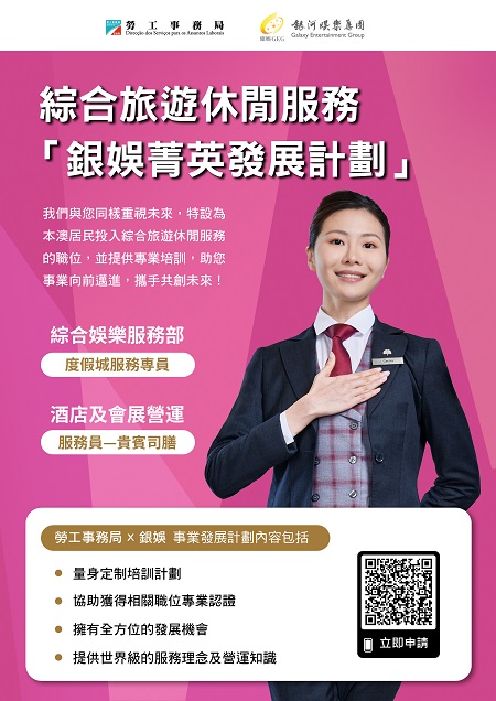 【本報訊】為支持本地人才全面發展,拓展多元職涯路向,勞工事務局和銀河娛樂集團(下稱“銀河娛樂”)合作推出“銀娛菁英發展計劃(綜合娛樂服務及酒店營運範疇)”(下稱“計劃”),以“先入職、後培訓”方式,為有志投身綜合休閒旅遊服務行業的澳門居民提供全方位培訓及發展階梯,計劃由8月13日起接受申請。