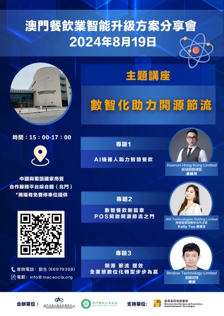 【本報訊】生產力暨科技轉移中心、餐飲行業協會合辦,經科局支持的“澳門餐飲業智能升級方案分享會”,將於8月19日下午3時在中國與葡語國家商貿合作服務平台綜合體舉行,透過介紹數字化工具協助企業實現開源節流的策略,讓業界掌握行業最新動向,歡迎餐飲業界及有興趣人士報名參與。