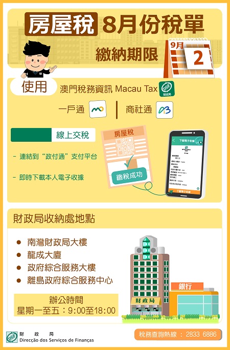 納稅人使用財政局“澳門稅務資訊Macau Tax”、“一戶通”或“商社通”移動應用程式繳納稅單功能,可連結到移動支付平台“政付通”直接繳交稅款。此外,繳納稅款後,更可即時查閱及下載名下已繳稅款的電子收據。