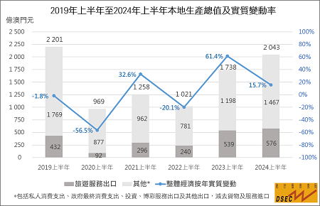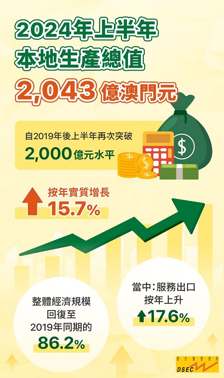 統計暨普查局資料顯示,2024年上半年本地生產總值為2,043億元(澳門元,下同),按年實質增長15.7%,整體經濟規模回復至2019年同期的86.2%,更是自2019年後再次突破2,000億元水平。當中,服務出口按年上升17.6%,內部需求(包括私人消費支出、政府最終消費支出及投資)亦錄得2.8%的增幅。