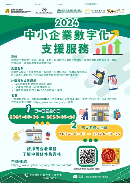 “2024中小企業數字化支援服務”計劃分兩期接受申請,2024年總支援名額由原來的600個提升至900個。今年第二期申請期為11月11日至29日,計劃申請對象為本澳從事零售、餐飲、生活服務等企業。詳情可瀏覽計劃網頁https://www.cpttm.org.mo/ecm/smetech2024/,或向生產力暨科技轉移中心查詢:電話:8898 0899(戴先生或譚先生)、電郵:ispu@cpttm.org.mo。