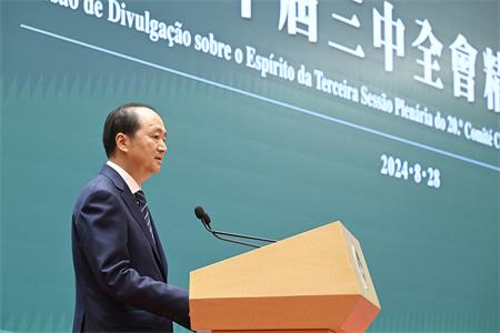 行政長官表示,學習宣傳貫徹二十屆三中全會精神是當前和今後一個時期全國的首要政治任務。二十屆三中全會關於全面深化改革的一系列新思想、新觀點、新論斷,凝結着對改革開放以來特別是新時代全面深化改革寶貴經驗的科學總結,是新時代全面深化改革理論創新、實踐創新的最新成果。我們要深入學習貫徹習近平主席關於全面深化改革的重要論述,堅持好、運用好貫穿其中的立場觀點方法,全力以赴抓好全會精神貫徹落實,把三中全會的決策部署轉化為實際行動,為推進中國式現代化貢獻力量。國家進一步全面深化改革,擴大高水平對外開放,為澳門帶來新的更廣闊發展空間。澳門特區政府將以強烈的責任擔當貫徹落實好二十屆三中全會決策部署,發揮“一國兩制”制度優勢和自身獨特優勢,把澳門國際大都市“金名片”擦得更亮,助力國家加快構建新發展格局。