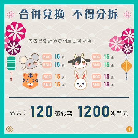 經確認實際登記人數後,每名已登記的澳門居民可兌換每家發鈔銀行發行的鼠年、牛年、虎年及兔年生肖鈔各15張,即每名居民合共可登記兌換120張生肖鈔,涉及兌換金額為1,200澳門元。兩家發鈔銀行的生肖鈔必須同時兌換,不得分拆。