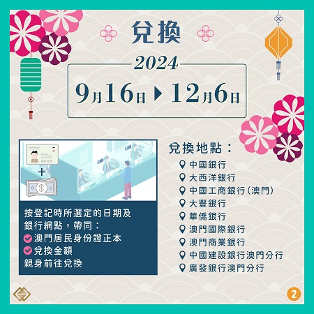 兌換期為2024916日至126日。登記人可按所選定的日期及銀行網點,帶備所要求的文件資料及兌換金額,親身或委託他人前往兌換,詳情可瀏覽金管局網頁:https://registration.amcm.gov.mo/banknotes/terms_zh.html。倘有查詢,可在辦公時間致電金管局專線(電話:2856 5071 / 2856 5072)。