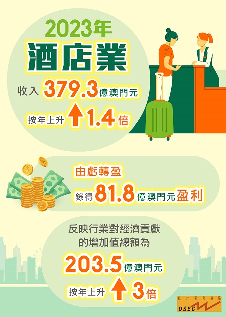 【本報訊】統計暨普查局資料顯示,2023年有營運的酒店及經濟型住宿場所按年增加12間至145間,在職員工增加27.8%至45,704人。隨著住客數目大幅增長,客房入住率回升帶動行業收入按年上升1.4倍至379.3億元(澳門元,下同);支出(不包括折舊及利息支付)亦增加41.1%至298.4億元。酒店業於2023年由虧轉盈,共錄得81.8億元盈利。反映行業對經濟貢獻的增加值總額同比上升3倍至203.5億元。