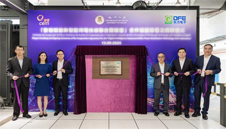 《數智賦能新型配用電技術聯合實驗室》合作協議由澳大校長宋永華、澳電執行委員會主席梁華權及東方電子方正基董事長簽訂,其後由澳大校長宋永華、澳大智慧城市物聯網國家重點實驗室副主任馬少丹、澳電執行委員會主席梁華權、澳電執行委員會執行董事張健、東方電子方正基董事長和煙台東方威思頓電氣有限公司總經理謝建國共同進行揭牌儀式。