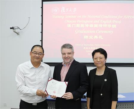 研修班結業式已於13日下午4時假復旦大學新聞學院大金報告廳舉行,出席嘉賓包括澳門基金會行政委員會主席吳志良、復旦大學新聞學院黨委書記陸柳等,並向出席學員頒發結業證書。