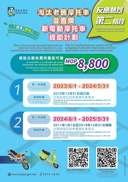 【本報訊】為進一步改善空氣質素及保障居民健康,落實國家“雙碳”目標,《淘汰老舊摩托車並置換新電動摩托車資助計劃》、《淘汰老舊柴油車資助計劃》的第二申請期現正接受申請,呼籲合資格申請者可於辦公時間內到指定地點提交申請。