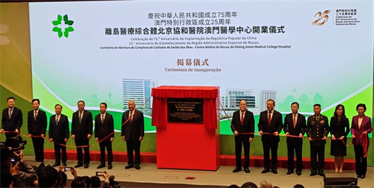 “慶祝中華人民共和國成立75周年 澳門特別行政區成立25周年 離島醫療綜合體北京協和醫院澳門醫學中心開業儀式”今(16)日在醫院綜合行政大樓4樓學術報告廳舉行。賀一誠,全國政協副主席何厚鏵,國家衛生健康委員會副主任曹雪濤,中央港澳辦、國務院港澳辦室務會成員向斌,澳門中聯辦副主任黃柳權,澳門社會文化司司長歐陽瑜,北京協和醫院名譽院長趙玉沛、院長張抒揚,澳門協和醫院院長吳文銘等嘉賓出席。