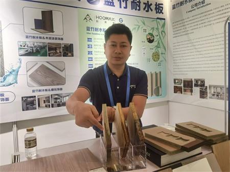 該公司藍竹項目部總監梅蔚軍表示,其公司生產的產品很多,而本次參展帶來的產品結合本屆“論壇”“攜手共建可靠、高效的全球木業供應鏈”主題,即用藍竹製造的板材料。他指出,目前中國提出的二氧化碳的碳排放力爭於2030年前達到峰值,努力爭取到2060年前實現碳中和目標,而公司研發的藍竹製造的各種建築、裝飾等材料,均符合負碳指標,同時也迎合社會的需求。
