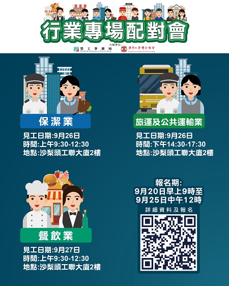926日上午舉辦保潔業配對會,提供59個職位空缺,涉及保安主任、高級保安員及清潔員等。下午舉辦旅運及公共運輸業配對會,提供46個職位空缺,涉及車長、站長、安全督導員及夜間安全專員。