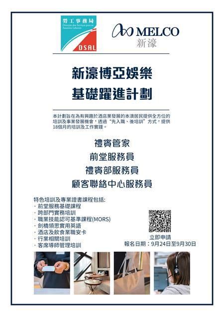 【本報訊】為培育本地人才並提供發展階梯,勞工事務局和新濠博亞娛樂有限公司(下稱“新濠”)合作推出“新濠博亞娛樂基礎躍進計劃—酒店營運”(下稱“計劃”),以“先入職、後培訓”方式,為有志投身綜合休閒旅遊服務行業的澳門居民提供全方位培訓及發展階梯,計劃由9月24日起接受申請。