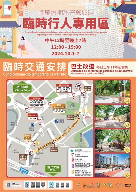 臨時行人專用區將於10月1日至7日每日中午12時至晚上7時,在氹仔舊城區設置。範圍由飛能便度街與素啤古街交界(嘉模泳池巴士站前),至告利雅施利華街與巴坡沙總督街交界(路氹歷史館),當中包括兵房斜巷至嘉路士米耶馬路部份路段。