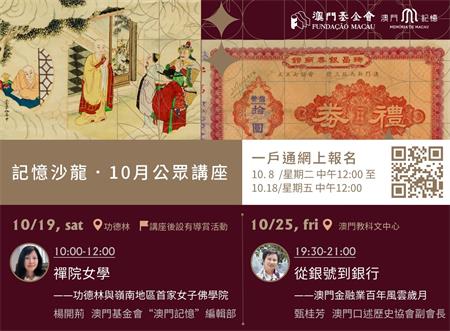 步入十月,“澳門記憶”將繼續為大家帶來兩場經典主題的“記憶沙龍”。首場講座由澳門基金會“澳門記憶”編輯部的楊開荊博士主講“禪院女學——功德林與嶺南地區首家女子佛學院”,將於1019日上午10時在功德林寺院內舉行。20235月,《澳門功德林寺院檔案文獻(1645-1980年)》成功申報聯合國教科文組織(UNESCO)《世界記憶(國際)名錄》,消息令人鼓舞。本次講座得到功德林寺院方大力支持,結合院內參觀活動,參與者有機會一睹這批珍貴的歷史文遺,是難得的歷史文化體驗。另一場講座將於1025日晚上19:30在澳門教科文中心舉行,由澳門口述歷史協會副會長甄桂芳主講,題為“從銀號到銀行——澳門金融業百年風雲歲月”。該講座是經由市民投票選出的“我最想重溫的記憶沙龍”之一,特別適合早前未能參加的朋友。機會難逢、切勿錯過!