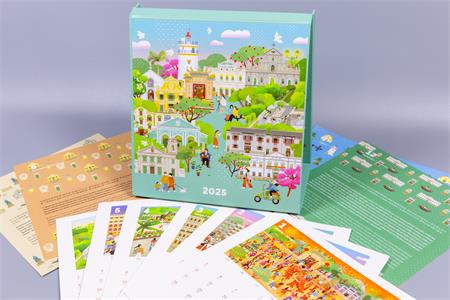 澳門歷史城區是中國境內現存年代最遠、規模最大、保存最完整和最集中,以西式建築為主、中西式建築互相輝映的歷史城區,在2005年7月15日被列入聯合國教科文組織《世界遺產名錄》,成為中國第31處世界遺產。明年是“澳門歷史城區”申遺成功20周年,文化局推出以“日往月來,最美邂逅”為題的2025年枱曆,由本地插畫師郝元春及設計師雷欣宜聯手創作,每月的日曆頁均包含“澳門歷史城區之最”的插圖,背頁附有相關文物說明,突顯澳門歷史城區獨特風貌,勾畫出日常人們的熙來攘往,反映了澳門居民生活與文化緊密相連的存在。外包裝以禮物形式呈現,打開後可作為枱曆支架,方便收藏。文化局期望藉着這份枱曆,讓公眾同來珍惜愛護澳門歷史城區,欣賞當中所蘊藏的文化內涵。
