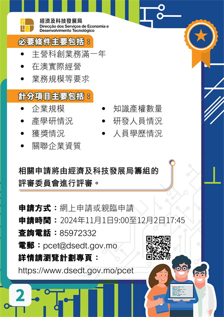 本輪申請期為2024111日至122日,申請者可透過經科局網上系統提交申請。對於獲認證的科技企業,特區政府已陸續在資金、人才及配對等多方面提供支援,有關申請詳情及相關的支援措施,可瀏覽計劃專頁(https://www.dsedt.gov.mo/pcet),或致電8597 2332查詢。