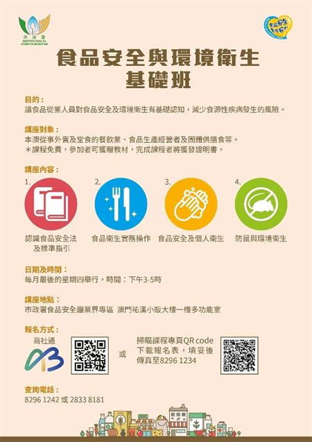 上述課程費用全免,完成課程者可獲發證明書。有意報讀的在職業界可透過“商社通”實體帳戶報名,或可下載報名表格並填妥後電郵至dir-info@iam.gov.mo、傳真至8296 1234、或於辦公時間遞交至祐漢小販大樓一樓食品業界專區或市政署各區市民服務中心報名。詳情可登入食品安全資訊網頁www.foodsafety.gov.mo “食安教育及培訓”欄目或掃描宣傳單張上的二維碼了解詳情。課程名額有限,額滿即止。如有任何查詢,可於辦公時間內致電8296 1242或8296 1231。
