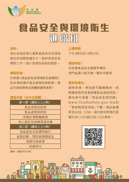 【本報訊】為提升食品業界的食安認知及操作水平,市政署持續提供系統性的食安培訓課程供業界人士報讀。十一月份食品安全與環境衛生基礎班及進階班課程現正招生,歡迎業界踴躍報讀。另外,市政署現已推出“食安心─衛生自查鼓勵計劃”,所有完成課程的餐廳皆可參與,藉此推動企業提高整體衛生管理水平和食品安全形象,詳情可瀏覽食品安全資訊網專頁。