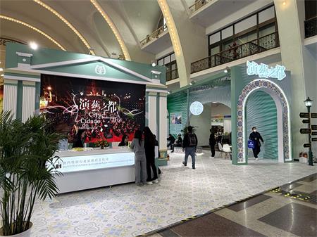 展館以“演藝之都”為主題,融入澳門世遺建築崗頂劇院的設計特色,透過文字、圖像及多媒體呈現方式,突顯澳門文化節慶盛事吸引力,現場設有“時空穿梭‧遊歷三巴”的沉浸式數字影像體驗區,參觀者可穿戴影像虛擬裝置,透過科技置身澳門世遺建築之境,亦可在展館選購澳門藝文節慶特色紀念品。是次參展展示了澳門國際幻彩大巡遊及澳門多個歷史片區的資訊,並藉此推廣崗頂劇院及未來澳門戶外表演區等演藝空間特色。