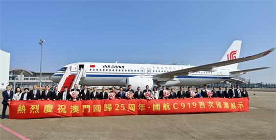 澳門行政長官代表運輸工務司司長羅立文、民航局局長潘華健,國務院國資委宣傳工作局副局長王瑩,南光(集團)有限公司總經理姜維亮、副總經理宋曉冬,澳門國際機場專營股份有限公司執委會主席陳穎雄、新濠博亞娛樂有限公司董事鍾玉文、澳門航空股份有限公司服務與商務副總經理張允、中國商用飛機有限責任公司營銷中心副總經理劉豔等嘉賓出席歡迎儀式,並迎接隨機而來的中國航空集團有限公司董事崔曉峰一行。