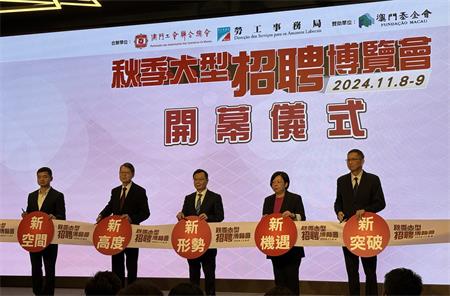 招聘博覽會開幕禮於今(8)日下午兩時舉行,中聯辦社工部副部長趙河清、澳門基金會行政委員會委員區榮智、勞工事務局代副局長李麗瓊、橫琴粵澳深度合作區民生事務局社會保障處代理副處長王雪豔等主要嘉賓,及各企業代表出席。