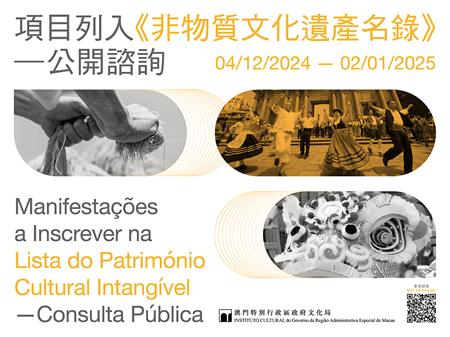 是次建議列入《非物質文化遺產名錄》的清單項目,包括:土地信俗、舞龍、舞獅、葡萄牙土風舞、春節、端午節、龍舟競賽、太極拳、葡撻製作技藝、杏仁餅製作技藝、嫁喜禮餅製作技藝及竹昇麵製作技藝。公開諮詢期由2024124日至202512日,並將於127日(周六)下午3時在澳門藝術博物館演講廳舉行公眾諮詢會,現場設有粵語、葡萄牙語和普通話即時傳譯及手語翻譯,歡迎市民踴躍參加發表意見。