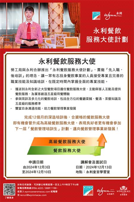如欲了解計劃章程的澳門居民可登入勞工局網站內相關專頁:https://www.dsal.gov.mo/zh_tw/standard/wynn_fbservice_ambassador.html,有意參加者可於12月3日至10日期間網上遞交申請。申請期結束後,永利澳門將陸續通知符合條件的申請人參加講座,詳細說明計劃的各項培訓內容及職涯發展階梯,講座後隨即安排面試。有關講座及面試日期為12月13日。請參加者保持電話暢通,以便接收永利澳門進一步通知。