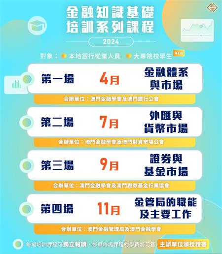 首三場課程由澳門金融學會,於4月、7月及9月分別與澳門銀行公會、澳門財資市場公會、澳門證券基金行業協會合辦,分別以金融體系與市場、外匯與貨幣市場,以及證券與基金市場為主題,邀請業界資深人士擔任講師,深入講解基礎概念與實務應用;第四場課程則由金管局與澳門金融學會於11月舉辦,介紹金管局作為澳門特區中央銀行機構的主要職能,讓學員深入了解澳門金融監管制度及規管要求,以及澳門現代金融業的發展趨勢。