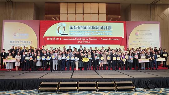 【本報訊】澳門旅遊局今(3)晚假JW萬豪酒店大宴會廳舉辦2024年度“星級旅遊服務認可計劃”餐飲及旅行社界別的頒獎典禮,嘉許本年度新參加或再次競逐的獲獎餐飲及旅行社商戶。今年獲“星級旅遊服務商戶獎”的餐飲界別共有312間,旅行社界別有44間,鼓勵澳門業界提供優質旅遊服務,共建有禮優秀旅遊目的地。