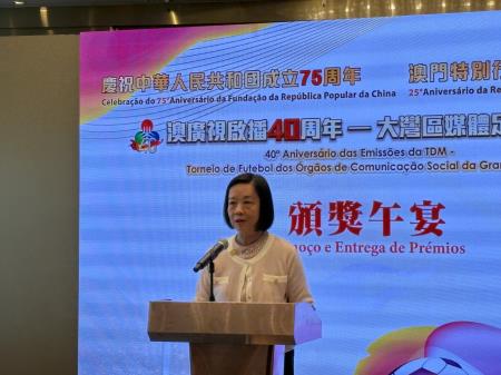 澳廣視執行委員會羅崇雯主席致辭時表示,此次足球賽把澳門多張名片“亮出來”,參賽球員的卓越球技,彰顯團結一致、遇強越強的精神風貌,成為澳門“體育之城”其中一個重要亮點;開球禮上《澳門好聲音》參賽歌手初試啼聲,是他們首次公開演出,代表著澳門“演藝之都”的名聲;向大灣區球隊及嘉賓致送澳廣視40周年原創紀念郵品,展示著澳門文創特色;舉辦“大灣區媒體足球邀請賽”頒獎午宴,期望各方在愉快氣氛下深入交流,期待大灣區各傳媒機構未來有更多合作交流機會,同時感受澳門作為“創意城市美食之都”的魅力。