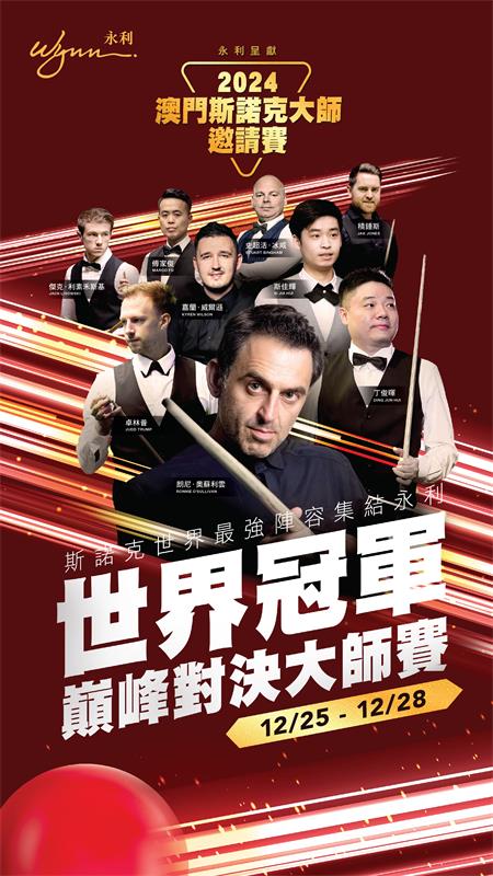 【本報訊】由永利渡假村(澳門)股份有限公司主辦、澳門特別行政區政府旅遊局和體育局支持、帆升體育協辦的《永利呈獻——2024澳門斯諾克大師邀請賽》將於12月25日至28日在永利皇宮宴會廳舉行。