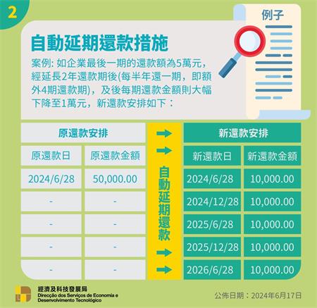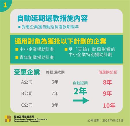 為紓緩中小企業償還貸款的壓力,特區政府透過第22/2024號行政法規,將上述計劃的還款期上限由8年延長至10年,相關措施於2024618日起生效。經科局以有序分批的方式,透過手機短訊及公函通知各受惠企業有關調整還款期的安排,受惠企業無須提出申請,藉以達到便民便商之目的。
